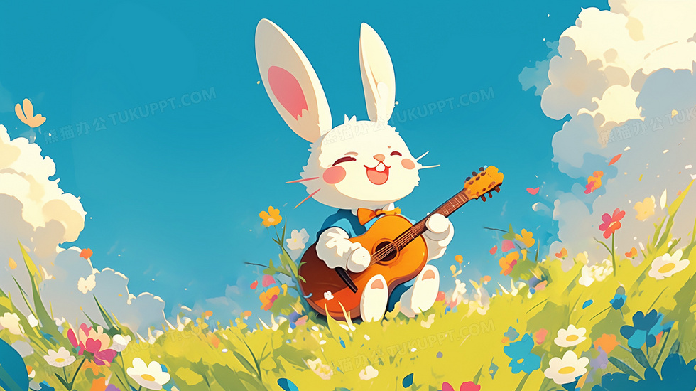 本作品内容为一只小白兔在草地上开心的弹吉他动物拟人插画, 格式为 jpg, 大小5 MB, 图片尺寸为2912 x 1632, 源文件无水印, 欢迎使用熊猫办公。 如认为平台内容涉嫌侵权,可通过邮件:tousu@tukuppt.com提出书面通知,我们将及时处理。