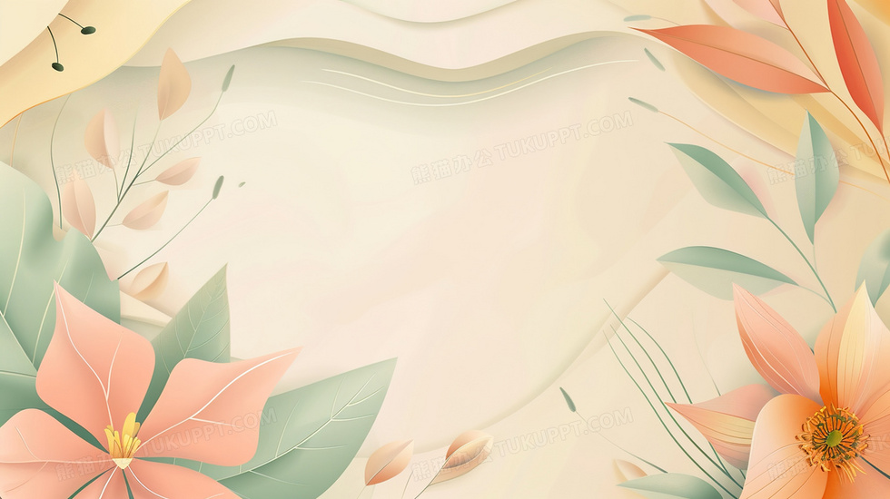 本作品内容为鲜花叶子装饰背景, 格式为 jpg, 大小2 MB, 图片尺寸为2912 x 1632, 作品中背景图片无需修改, 源文件无水印,可以直接使用, 欢迎使用熊猫办公。 如认为平台内容涉嫌侵权,可通过邮件:tousu@tukuppt.com提出书面通知,我们将及时处理。
