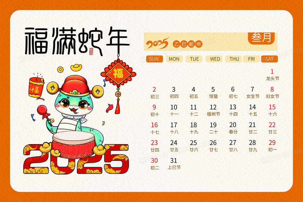 本作品内容为2025福满蛇年乙巳年春节日历三月插画, 格式为 psd, 大小52 MB, 请使用软件PhotoShop(CC)打开, 源文件无水印, 欢迎使用熊猫办公。 如认为平台内容涉嫌侵权,可通过邮件:tousu@tukuppt.com提出书面通知,我们将及时处理。