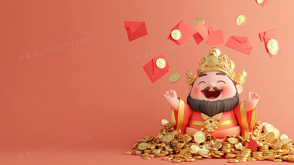 本作品内容为创意新年财神背景, 格式为 jpg, 大小2 MB, 图片尺寸为2912 x 1632, 作品中背景图片无需修改, 源文件无水印,可以直接使用, 欢迎使用熊猫办公。 如认为平台内容涉嫌侵权,可通过邮件:tousu@tukuppt.com提出书面通知,我们将及时处理。
