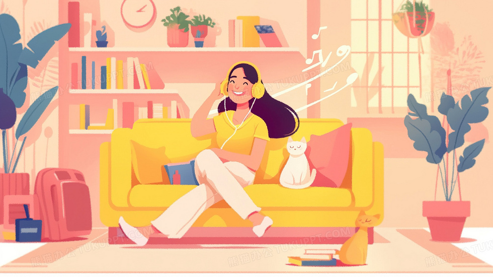 本作品内容为坐沙发手机听音乐的女孩和宠物猫插画, 格式为 jpg, 大小2 MB, 图片尺寸为2912 x 1632, 源文件无水印, 欢迎使用熊猫办公。 如认为平台内容涉嫌侵权,可通过邮件:tousu@tukuppt.com提出书面通知,我们将及时处理。