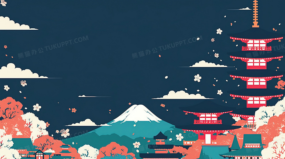 本作品内容为卡通日本富士山建筑景色背景, 格式为 jpg, 大小2 MB, 图片尺寸为2912 x 1632, 作品中背景图片无需修改, 源文件无水印,可以直接使用, 欢迎使用熊猫办公。 如认为平台内容涉嫌侵权,可通过邮件:tousu@tukuppt.com提出书面通知,我们将及时处理。