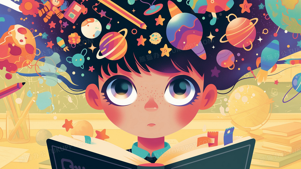 本作品内容为女孩看书状态下的天马行空创意插画, 格式为 jpg, 大小5 MB, 图片尺寸为2912 x 1632, 源文件无水印, 欢迎使用熊猫办公。 如认为平台内容涉嫌侵权,可通过邮件:tousu@tukuppt.com提出书面通知,我们将及时处理。