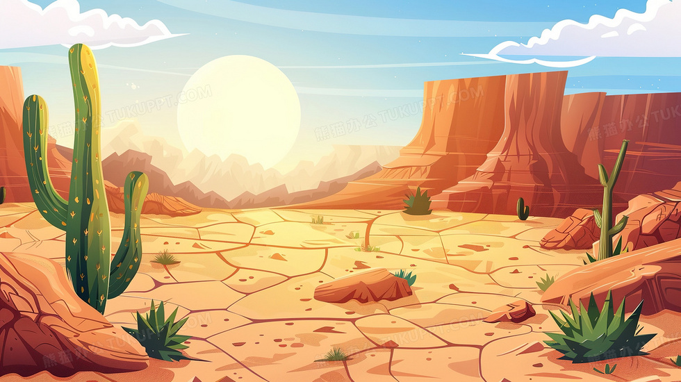 本作品内容为沙漠仙人掌干涸开裂的地面插画, 格式为 jpg, 大小3 MB, 图片尺寸为2912 x 1632, 源文件无水印, 欢迎使用熊猫办公。 如认为平台内容涉嫌侵权,可通过邮件:tousu@tukuppt.com提出书面通知,我们将及时处理。