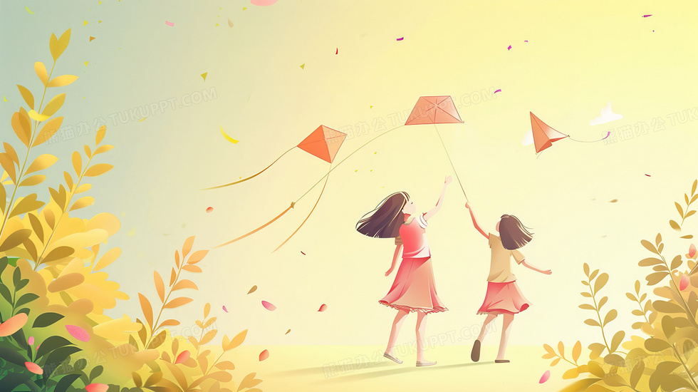 本作品内容为黄色背景下两个孩子在草地上放风筝插画, 格式为 jpg, 大小2 MB, 图片尺寸为2912 x 1632, 源文件无水印, 欢迎使用熊猫办公。 如认为平台内容涉嫌侵权,可通过邮件:tousu@tukuppt.com提出书面通知,我们将及时处理。