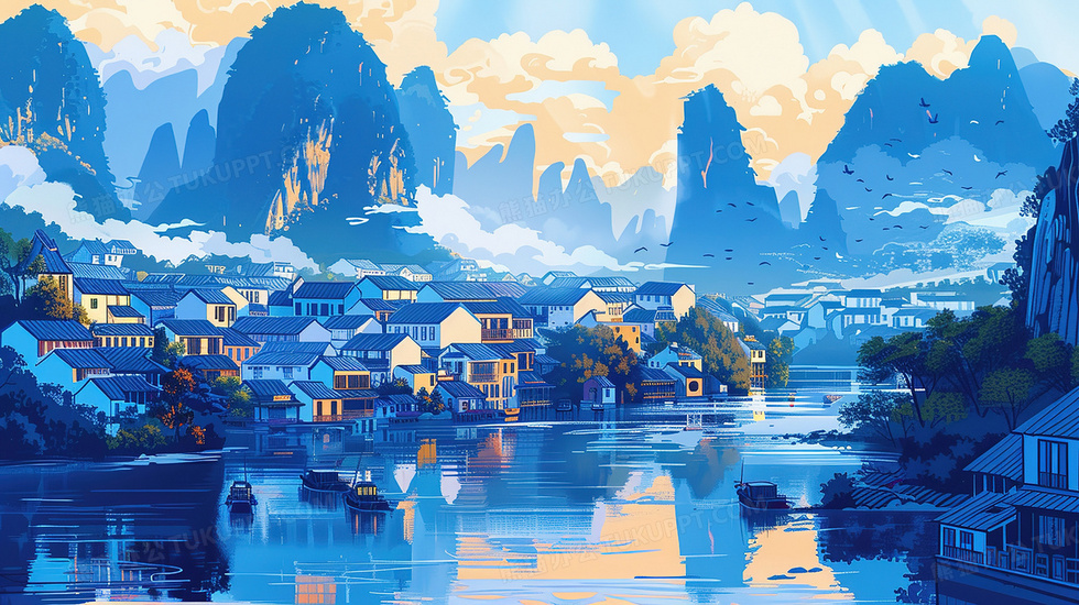 本作品内容为山谷河流旁的古建筑群插画, 格式为 jpg, 大小4 MB, 图片尺寸为2912 x 1632, 源文件无水印, 欢迎使用熊猫办公。 如认为平台内容涉嫌侵权,可通过邮件:tousu@tukuppt.com提出书面通知,我们将及时处理。