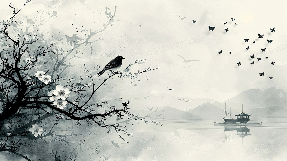 本作品内容为中国风黑白梅花水墨插画, 格式为 jpg, 大小4 MB, 图片尺寸为2912 x 1632, 源文件无水印, 欢迎使用熊猫办公。 如认为平台内容涉嫌侵权,可通过邮件:tousu@tukuppt.com提出书面通知,我们将及时处理。