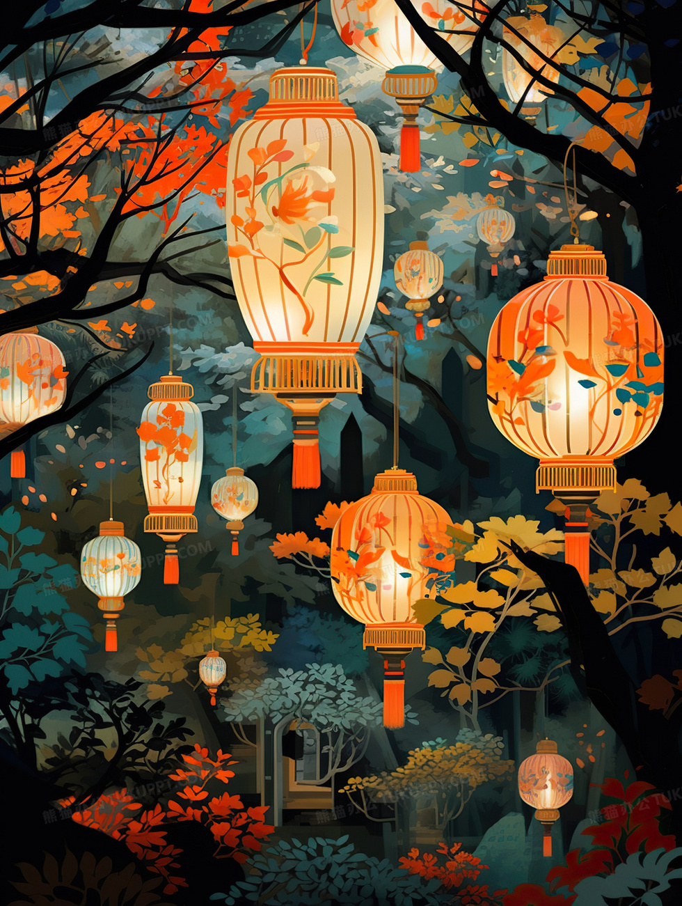 本作品内容为2024新年国潮新年喜庆元宵节灯笼插画, 格式为 jpg, 大小4 MB, 图片尺寸为1856 x 2464, 源文件无水印, 欢迎使用熊猫办公。 如认为平台内容涉嫌侵权,可通过邮件:tousu@tukuppt.com提出书面通知,我们将及时处理。