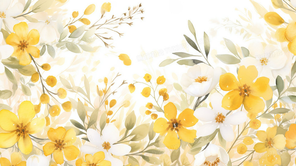 本作品内容为黄色花朵和灰绿色叶子装饰插画, 格式为 jpg, 大小2 MB, 图片尺寸为2912 x 1632, 源文件无水印, 欢迎使用熊猫办公。 如认为平台内容涉嫌侵权,可通过邮件:tousu@tukuppt.com提出书面通知,我们将及时处理。