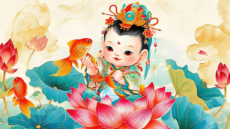 首页 > 插画 > 科技艺术 > 国潮风 > 喜庆吉祥荷花锦鲤可爱的年画娃娃