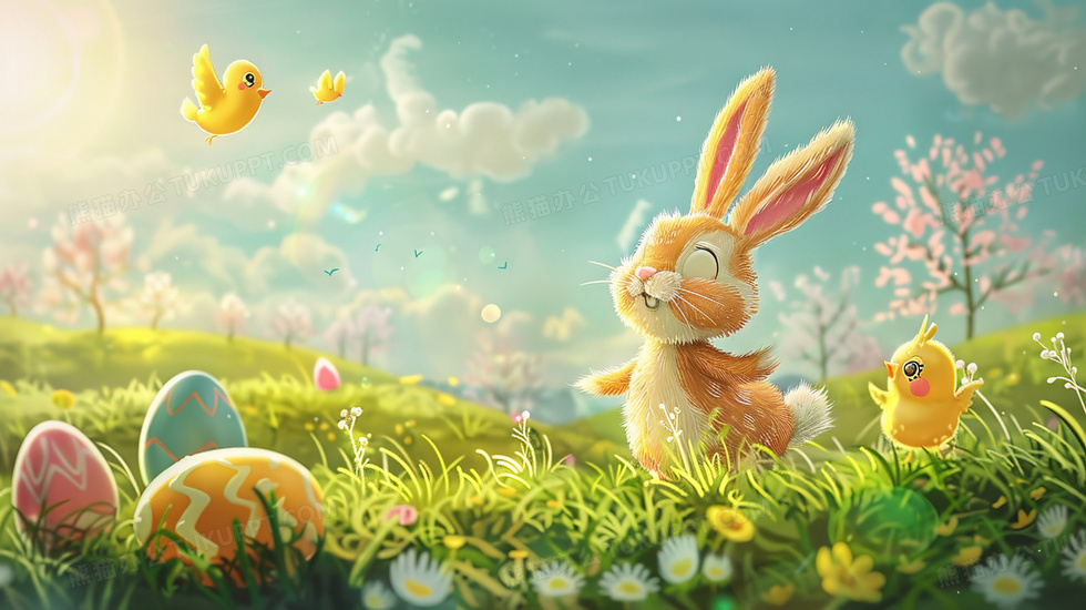 本作品内容为阳光明媚的田野里复活节兔子和小鸡插画, 格式为 jpg, 大小3 MB, 图片尺寸为2912 x 1632, 源文件无水印, 欢迎使用熊猫办公。 如认为平台内容涉嫌侵权,可通过邮件:tousu@tukuppt.com提出书面通知,我们将及时处理。