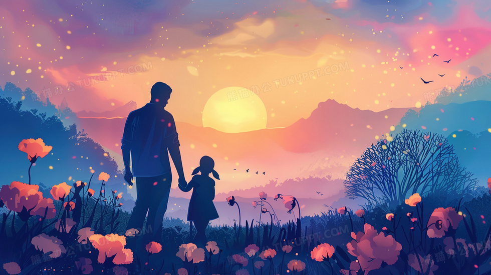 本作品内容为山野花田里父亲带着女儿欣赏夕阳插画, 格式为 jpg, 大小3 MB, 图片尺寸为2912 x 1632, 源文件无水印, 欢迎使用熊猫办公。 如认为平台内容涉嫌侵权,可通过邮件:tousu@tukuppt.com提出书面通知,我们将及时处理。