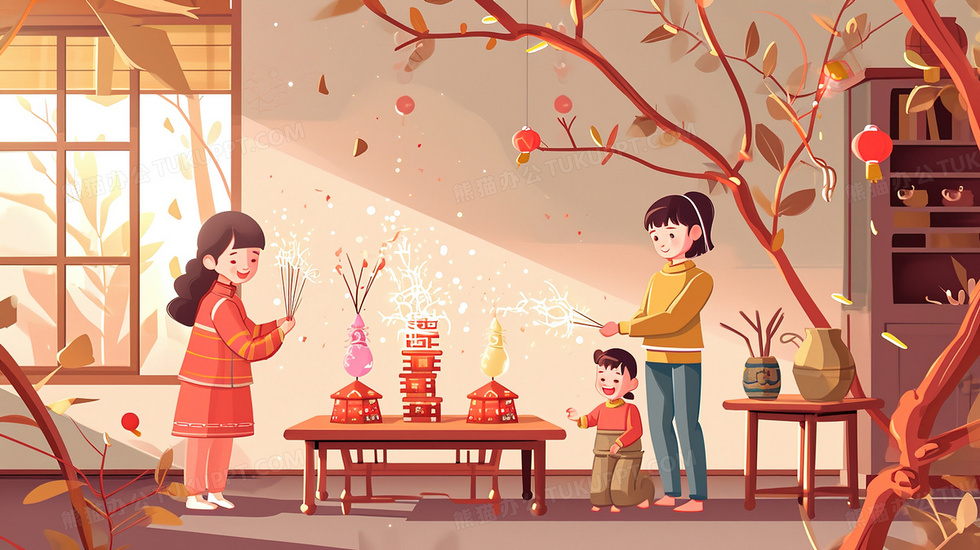 本作品内容为春节大人小孩一起放烟花的插画, 格式为 jpg, 大小3 MB, 图片尺寸为2912 x 1632, 源文件无水印, 欢迎使用熊猫办公。 如认为平台内容涉嫌侵权,可通过邮件:tousu@tukuppt.com提出书面通知,我们将及时处理。
