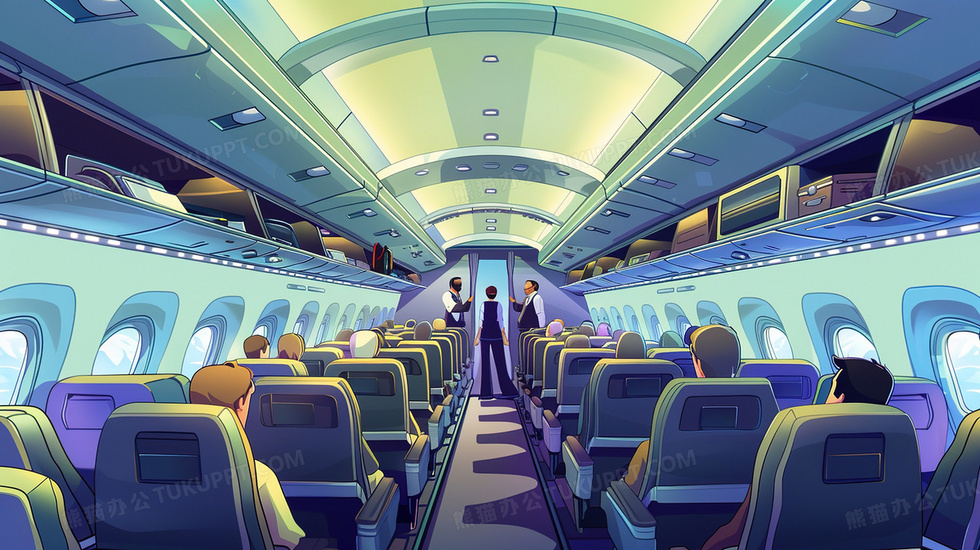 本作品内容为飞机机舱内部场景插画, 格式为 jpg, 大小3 MB, 图片尺寸为2912 x 1632, 源文件无水印, 欢迎使用熊猫办公。 如认为平台内容涉嫌侵权,可通过邮件:tousu@tukuppt.com提出书面通知,我们将及时处理。