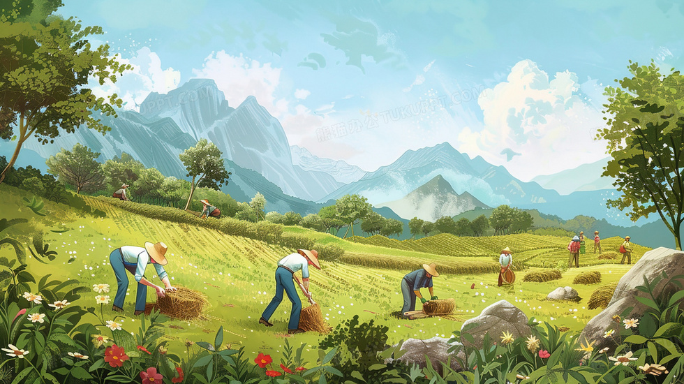 本作品内容为田野中劳动的人们插画, 格式为 jpg, 大小4 MB, 图片尺寸为2912 x 1632, 源文件无水印, 欢迎使用熊猫办公。 如认为平台内容涉嫌侵权,可通过邮件:tousu@tukuppt.com提出书面通知,我们将及时处理。