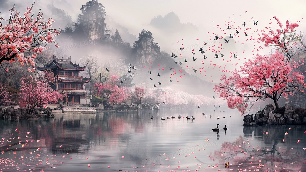 本作品内容为古风湖面自然风景寺庙插画, 格式为 jpg, 大小3 MB, 图片尺寸为2240 x 1256, 源文件无水印, 欢迎使用熊猫办公。 如认为平台内容涉嫌侵权,可通过邮件:tousu@tukuppt.com提出书面通知,我们将及时处理。