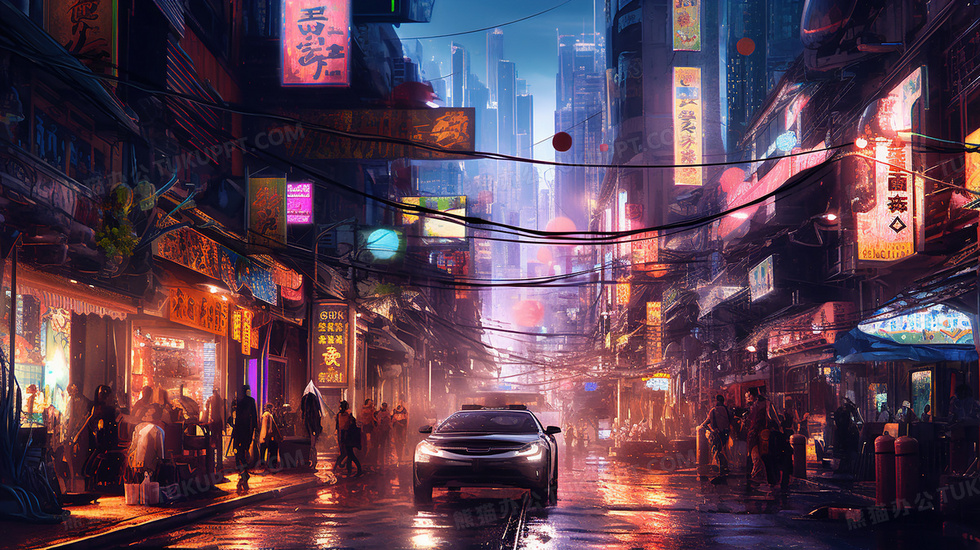 本作品内容为彩色赛博朋克风城市街景, 格式为 jpg, 大小7 MB, 图片尺寸为2912 x 1632, 源文件无水印, 欢迎使用熊猫办公。 如认为平台内容涉嫌侵权,可通过邮件:tousu@tukuppt.com提出书面通知,我们将及时处理。