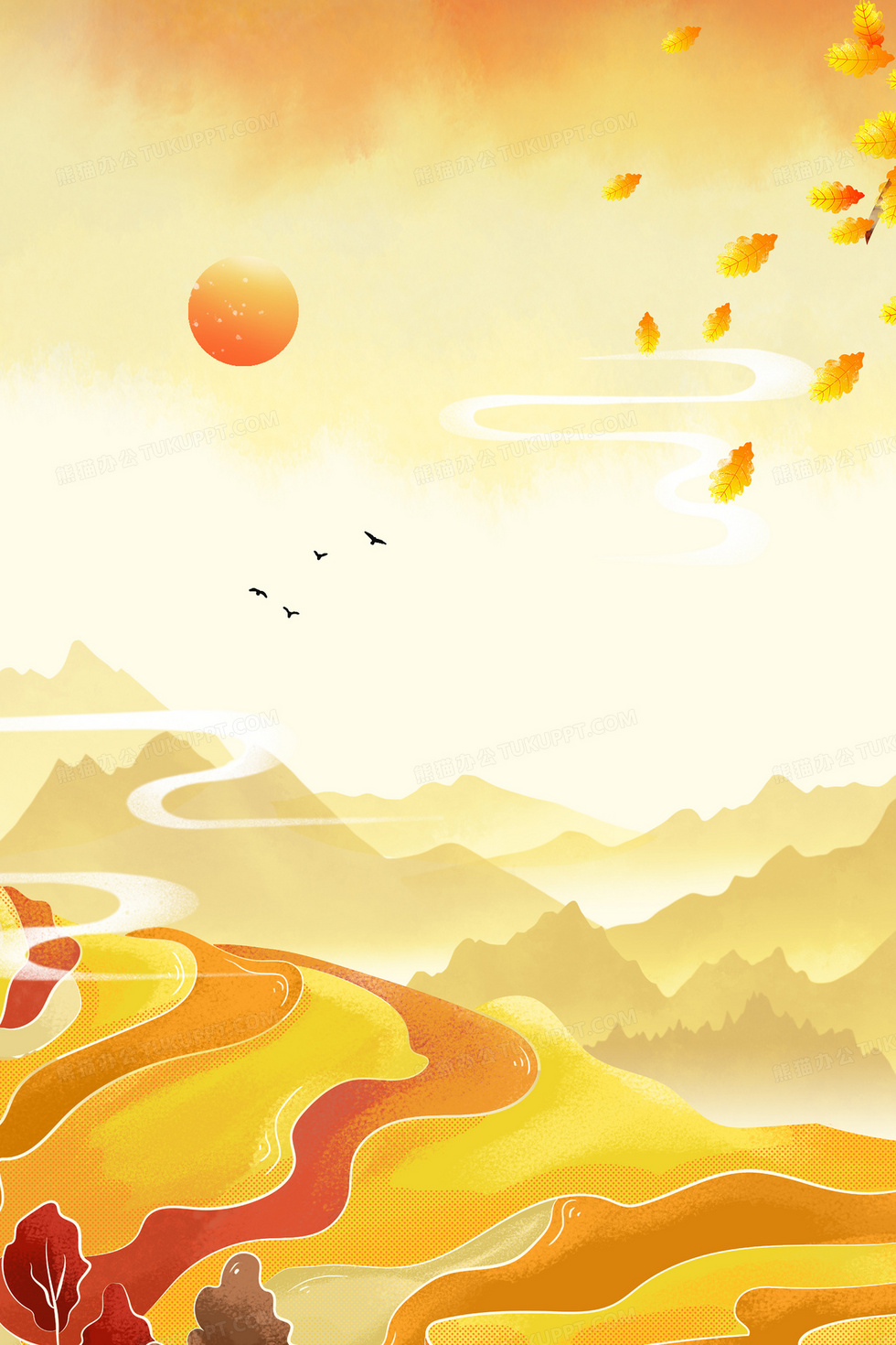 本作品内容为秋季梯田山水元素背景, 格式为 psd, 大小107 MB, 图片尺寸为3543 x 5314, 作品中背景图片无需修改, 源文件无水印,可以直接使用, 欢迎使用熊猫办公。 如认为平台内容涉嫌侵权,可通过邮件:tousu@tukuppt.com提出书面通知,我们将及时处理。