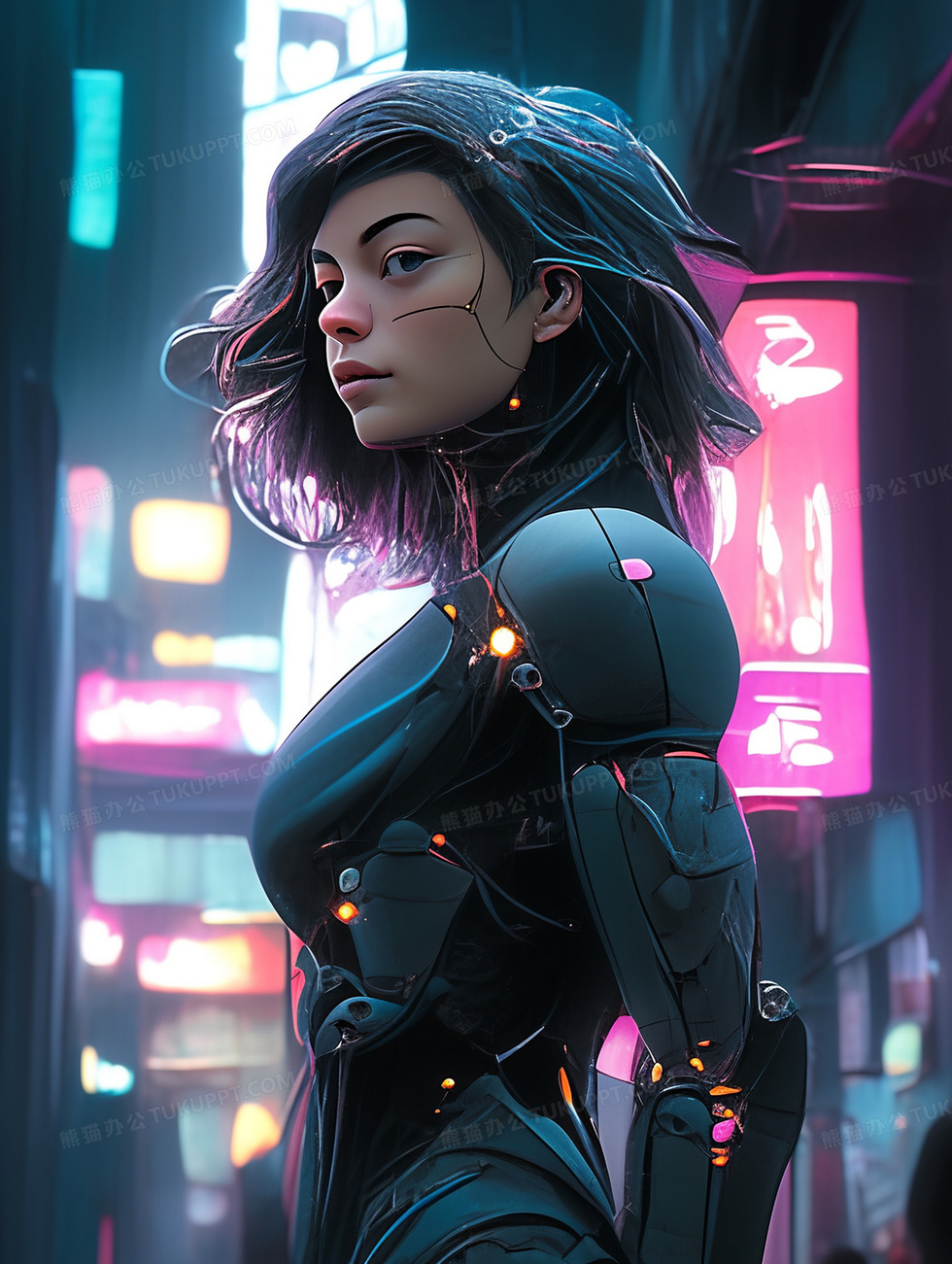 本作品内容为赛博朋克风格机甲女孩, 格式为 jpg, 大小3 MB, 图片尺寸为1856 x 2464, 源文件无水印, 欢迎使用熊猫办公。 如认为平台内容涉嫌侵权,可通过邮件:tousu@tukuppt.com提出书面通知,我们将及时处理。