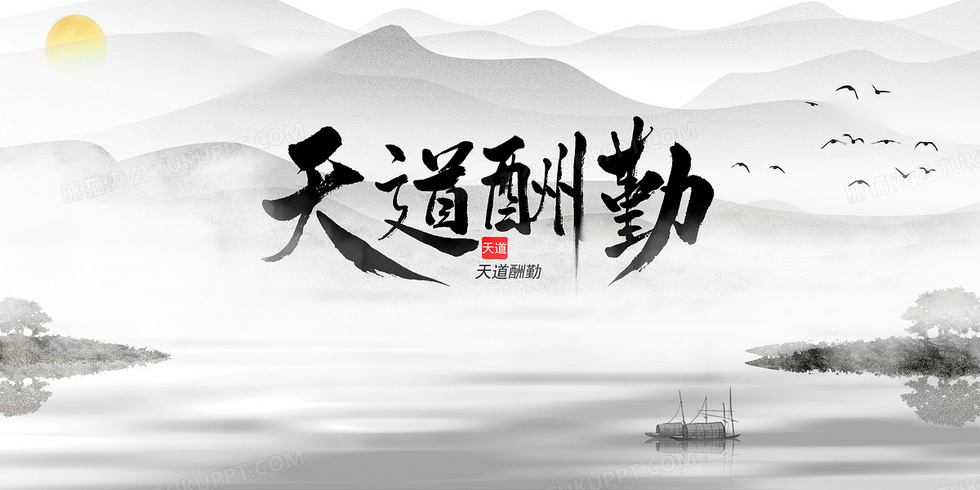 本作品内容为简约水墨天道酬勤背景, 格式为 psd, 大小38 MB, 图片尺寸为4724 x 2362, 作品中背景图片无需修改, 源文件无水印,可以直接使用, 欢迎使用熊猫办公。 如认为平台内容涉嫌侵权,可通过邮件:tousu@tukuppt.com提出书面通知,我们将及时处理。
