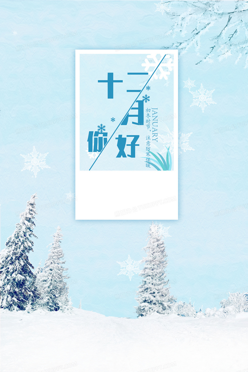 本作品内容为12月你好冬季小清新雪景背景, 格式为 psd, 大小66 MB, 图片尺寸为3543 x 5315, 作品中背景图片无需修改, 源文件无水印,可以直接使用, 欢迎使用熊猫办公。 如认为平台内容涉嫌侵权,可通过邮件:tousu@tukuppt.com提出书面通知,我们将及时处理。
