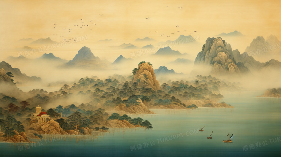 本作品内容为秋季传统古典中国风山水风景插画, 格式为 jpg, 大小5 MB, 图片尺寸为2912 x 1632, 源文件无水印, 欢迎使用熊猫办公。 如认为平台内容涉嫌侵权,可通过邮件:tousu@tukuppt.com提出书面通知,我们将及时处理。
