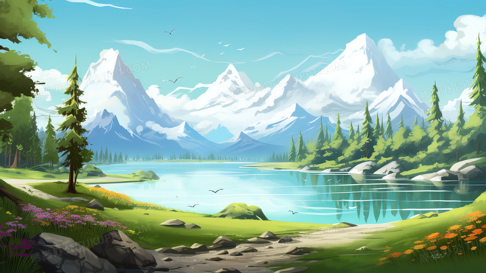 本作品内容为春天大山森林的湖泊插画, 格式为 jpg, 大小5 MB, 图片尺寸为2912 x 1632, 源文件无水印, 欢迎使用熊猫办公。 如认为平台内容涉嫌侵权,可通过邮件:tousu@tukuppt.com提出书面通知,我们将及时处理。