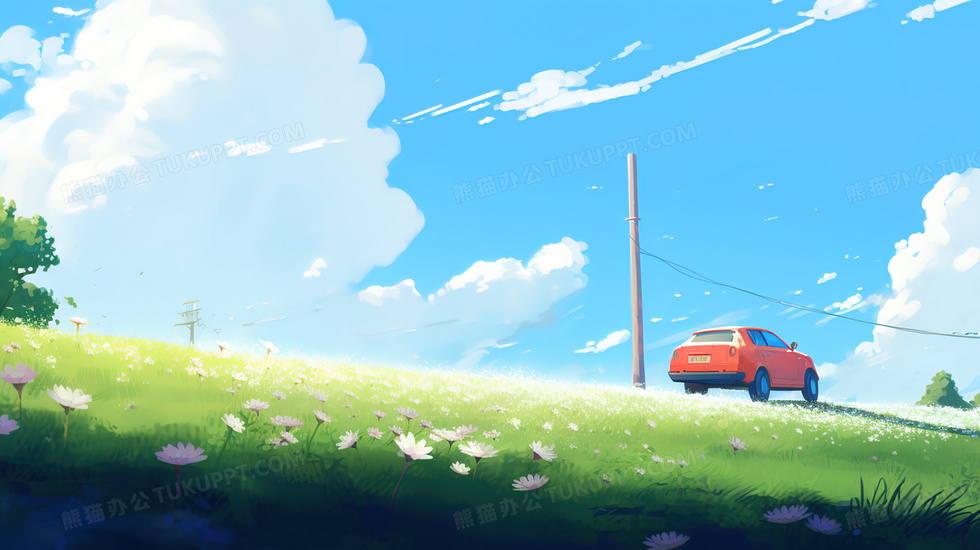 本作品内容为春季山野草地小道上停着的小汽车插画, 格式为 jpg, 大小5 MB, 图片尺寸为2912 x 1632, 源文件无水印, 欢迎使用熊猫办公。 如认为平台内容涉嫌侵权,可通过邮件:tousu@tukuppt.com提出书面通知,我们将及时处理。