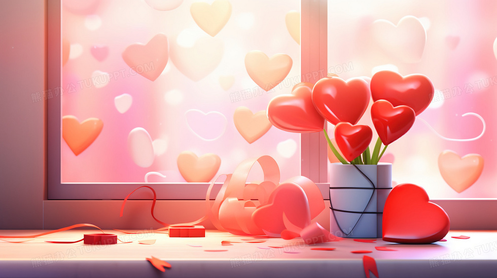 本作品内容为窗户边的桌上的C4D粉红色爱心插画, 格式为 jpg, 大小4 MB, 图片尺寸为2912 x 1632, 源文件无水印, 欢迎使用熊猫办公。 如认为平台内容涉嫌侵权,可通过邮件:tousu@tukuppt.com提出书面通知,我们将及时处理。