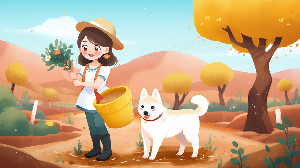 本作品内容为女孩与小狗在沙漠化土地种树插画, 格式为 jpg, 大小2 MB, 图片尺寸为2912 x 1632, 源文件无水印, 欢迎使用熊猫办公。 如认为平台内容涉嫌侵权,可通过邮件:tousu@tukuppt.com提出书面通知,我们将及时处理。