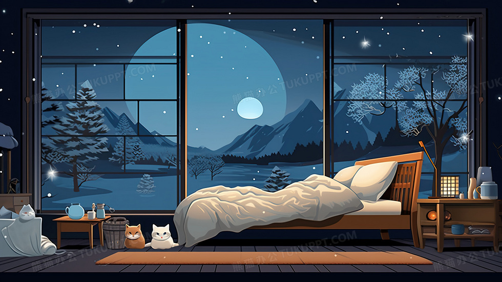 本作品内容为冬天室内卧室场景唯美插画, 格式为 jpg, 大小5 MB, 图片尺寸为2912 x 1632, 源文件无水印, 欢迎使用熊猫办公。 如认为平台内容涉嫌侵权,可通过邮件:tousu@tukuppt.com提出书面通知,我们将及时处理。
