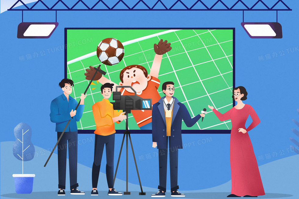 本作品内容为电视台实时转播运动会足球赛现场解说插画, 格式为 psd, 大小33 MB, 请使用软件PhotoShop(CS6)打开, 源文件无水印, 欢迎使用熊猫办公。 如认为平台内容涉嫌侵权,可通过邮件:tousu@tukuppt.com提出书面通知,我们将及时处理。