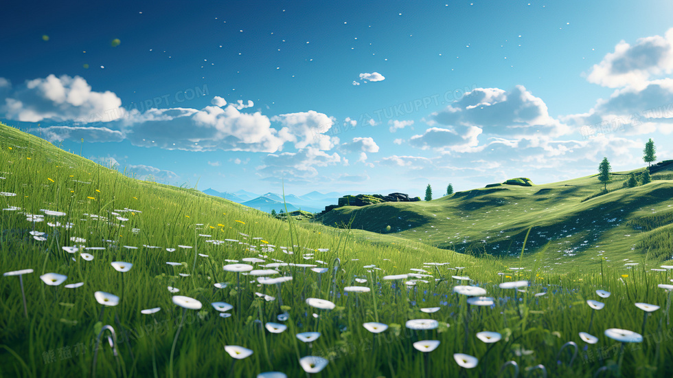 本作品内容为蓝天白云下鲜花盛开的青青草地插画, 格式为 jpg, 大小7 MB, 图片尺寸为2912 x 1632, 源文件无水印, 欢迎使用熊猫办公。 如认为平台内容涉嫌侵权,可通过邮件:tousu@tukuppt.com提出书面通知,我们将及时处理。