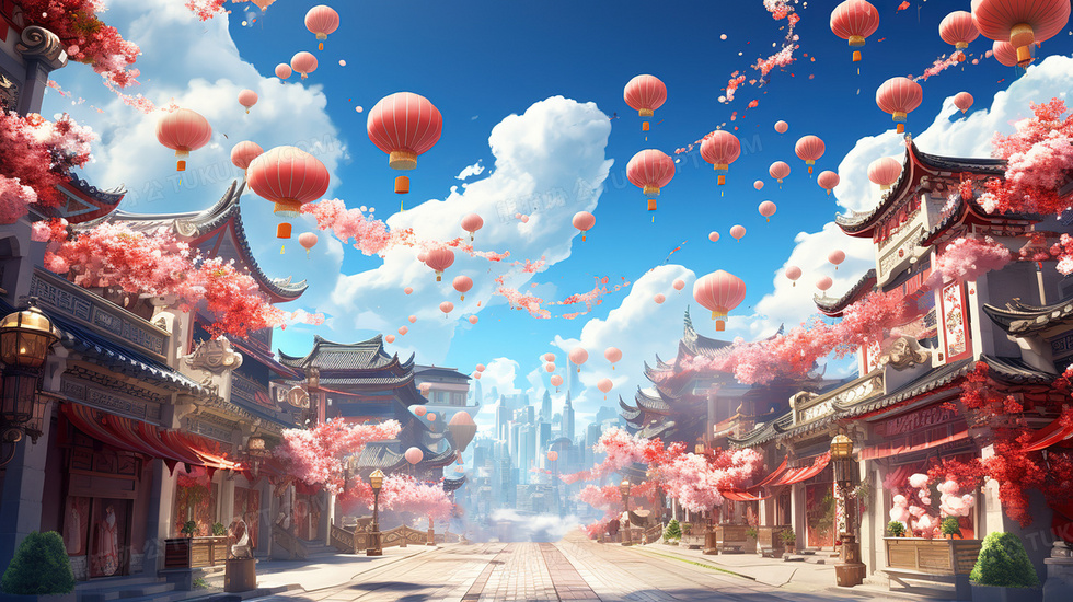 本作品内容为挂满红灯笼的古色古香的街道节日场景插画, 格式为 jpg, 大小8 MB, 图片尺寸为2912 x 1632, 源文件无水印, 欢迎使用熊猫办公。 如认为平台内容涉嫌侵权,可通过邮件:tousu@tukuppt.com提出书面通知,我们将及时处理。