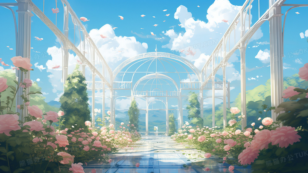 本作品内容为蓝天白云唯美梦幻玻璃花房下的粉色玫瑰花创意插画, 格式为 jpg, 大小6 MB, 图片尺寸为2912 x 1632, 源文件无水印, 欢迎使用熊猫办公。 如认为平台内容涉嫌侵权,可通过邮件:tousu@tukuppt.com提出书面通知,我们将及时处理。