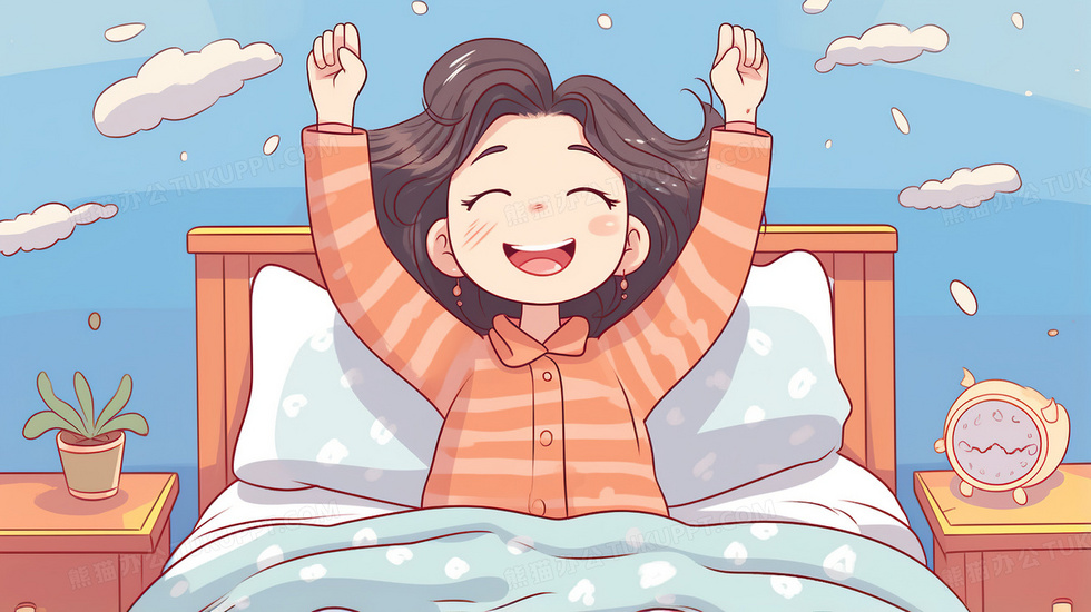 本作品内容为假期起床伸懒腰睡懒觉惬意场景插画, 格式为 jpg, 大小5 MB, 图片尺寸为2912 x 1632, 源文件无水印, 欢迎使用熊猫办公。 如认为平台内容涉嫌侵权,可通过邮件:tousu@tukuppt.com提出书面通知,我们将及时处理。