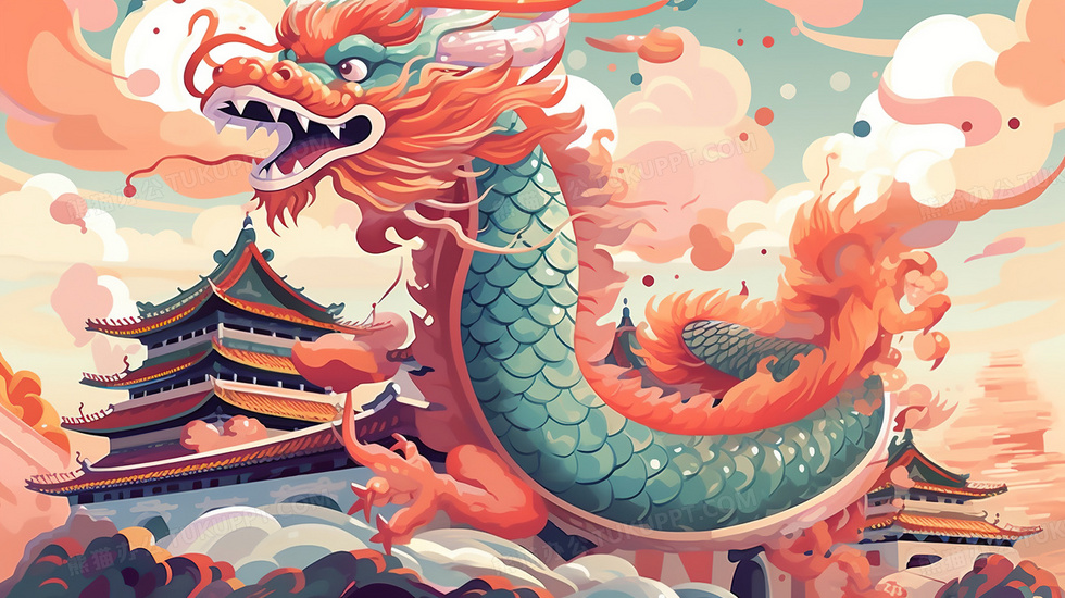 本作品内容为新年喜庆中国龙大好河山建筑插画, 格式为 jpg, 大小6 MB, 图片尺寸为2912 x 1632, 源文件无水印, 欢迎使用熊猫办公。 如认为平台内容涉嫌侵权,可通过邮件:tousu@tukuppt.com提出书面通知,我们将及时处理。