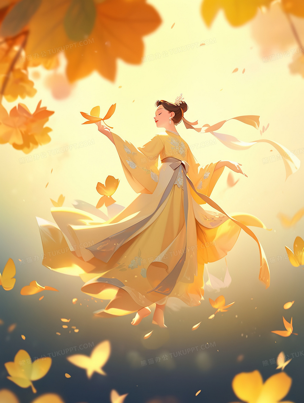 本作品内容为金色树叶下古典长裙女孩人物插画, 格式为 jpg, 大小4 MB, 图片尺寸为1856 x 2464, 源文件无水印, 欢迎使用熊猫办公。 如认为平台内容涉嫌侵权,可通过邮件:tousu@tukuppt.com提出书面通知,我们将及时处理。