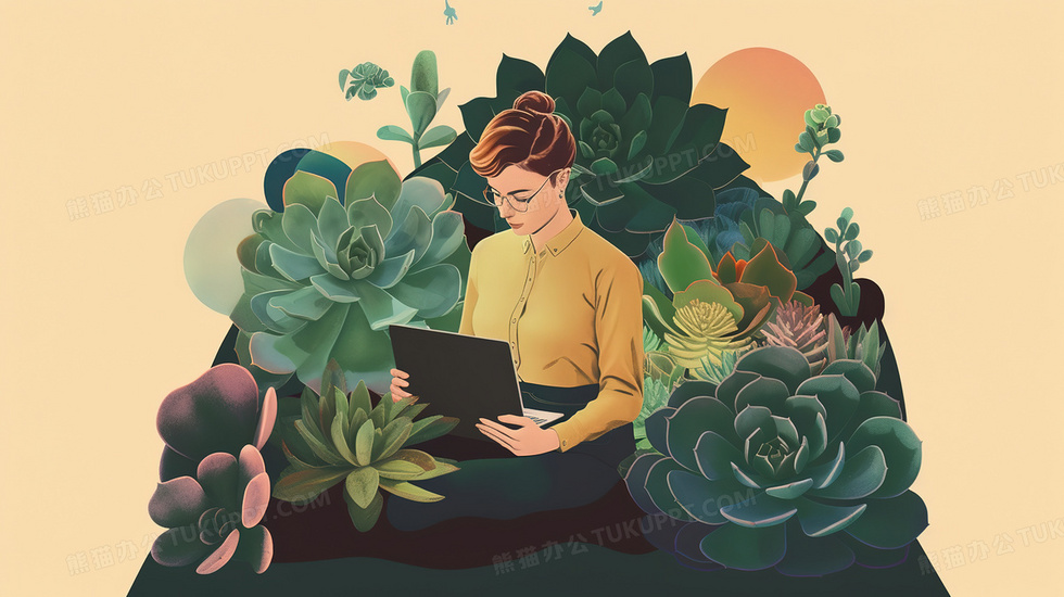 本作品内容为绿植中商务办公女士插画, 格式为 jpg, 大小5 MB, 图片尺寸为2912 x 1632, 源文件无水印, 欢迎使用熊猫办公。 如认为平台内容涉嫌侵权,可通过邮件:tousu@tukuppt.com提出书面通知,我们将及时处理。