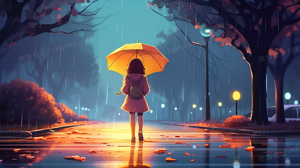 本作品内容为一个雨中打伞独自在路上行走的可爱女孩插画, 格式为 jpg, 大小4 MB, 图片尺寸为2912 x 1632, 源文件无水印, 欢迎使用熊猫办公。 如认为平台内容涉嫌侵权,可通过邮件:tousu@tukuppt.com提出书面通知,我们将及时处理。