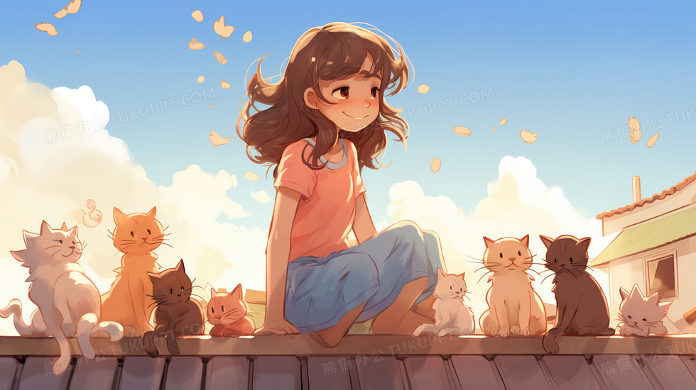 本作品内容为屋顶上的女孩和猫咪卡通插画, 格式为 jpg, 大小4 MB, 图片尺寸为2912 x 1632, 源文件无水印, 欢迎使用熊猫办公。 如认为平台内容涉嫌侵权,可通过邮件:tousu@tukuppt.com提出书面通知,我们将及时处理。