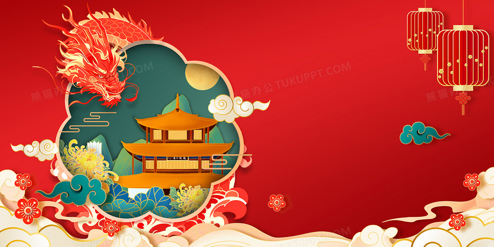 本作品内容为龙年新年剪纸风喜庆新年背景, 格式为 psd, 大小25 MB, 图片尺寸为4724 x 2362, 作品中背景图片无需修改, 源文件无水印,可以直接使用, 欢迎使用熊猫办公。 如认为平台内容涉嫌侵权,可通过邮件:tousu@tukuppt.com提出书面通知,我们将及时处理。