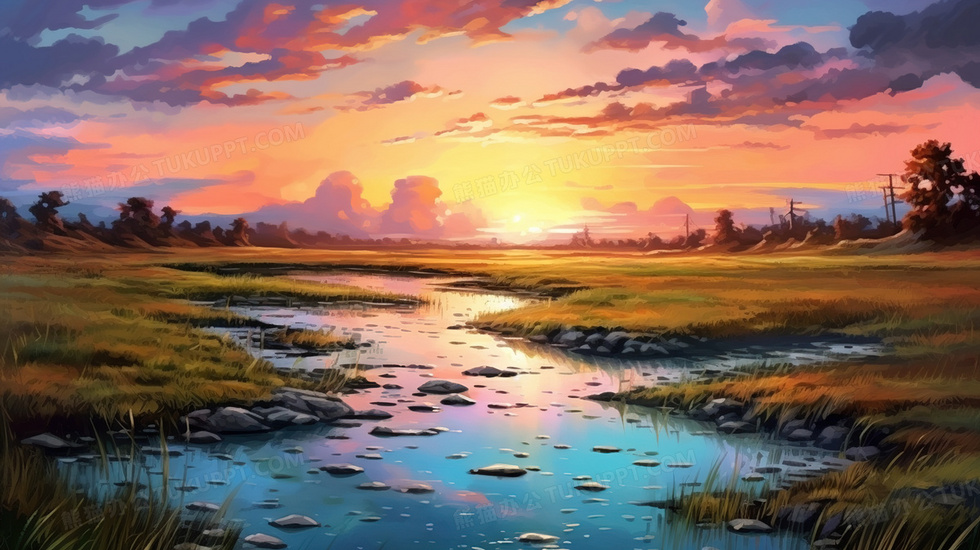本作品内容为落日长河唯美风景插画, 格式为 jpg, 大小5 MB, 图片尺寸为2912 x 1632, 源文件无水印, 欢迎使用熊猫办公。 如认为平台内容涉嫌侵权,可通过邮件:tousu@tukuppt.com提出书面通知,我们将及时处理。