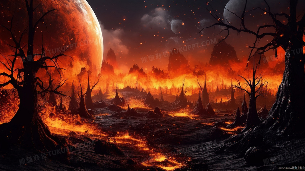 本作品内容为外太空世界末日大火蔓延风景插画, 格式为 jpg, 大小6 MB, 图片尺寸为2912 x 1632, 源文件无水印, 欢迎使用熊猫办公。 如认为平台内容涉嫌侵权,可通过邮件:tousu@tukuppt.com提出书面通知,我们将及时处理。