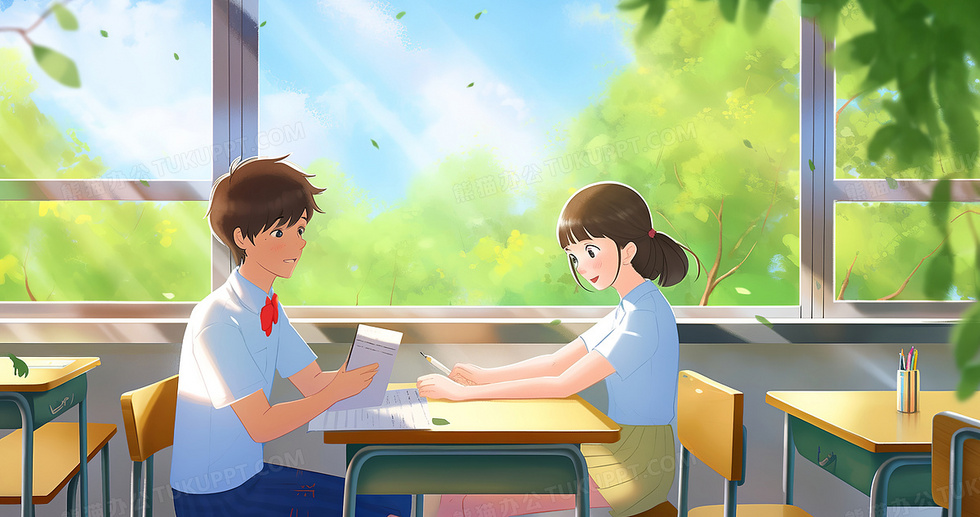 本作品内容为两个学生在教室学习讨论作业创意插画, 格式为 jpg, 大小8 MB, 图片尺寸为5824 x 3072, 源文件无水印, 欢迎使用熊猫办公。 如认为平台内容涉嫌侵权,可通过邮件:tousu@tukuppt.com提出书面通知,我们将及时处理。