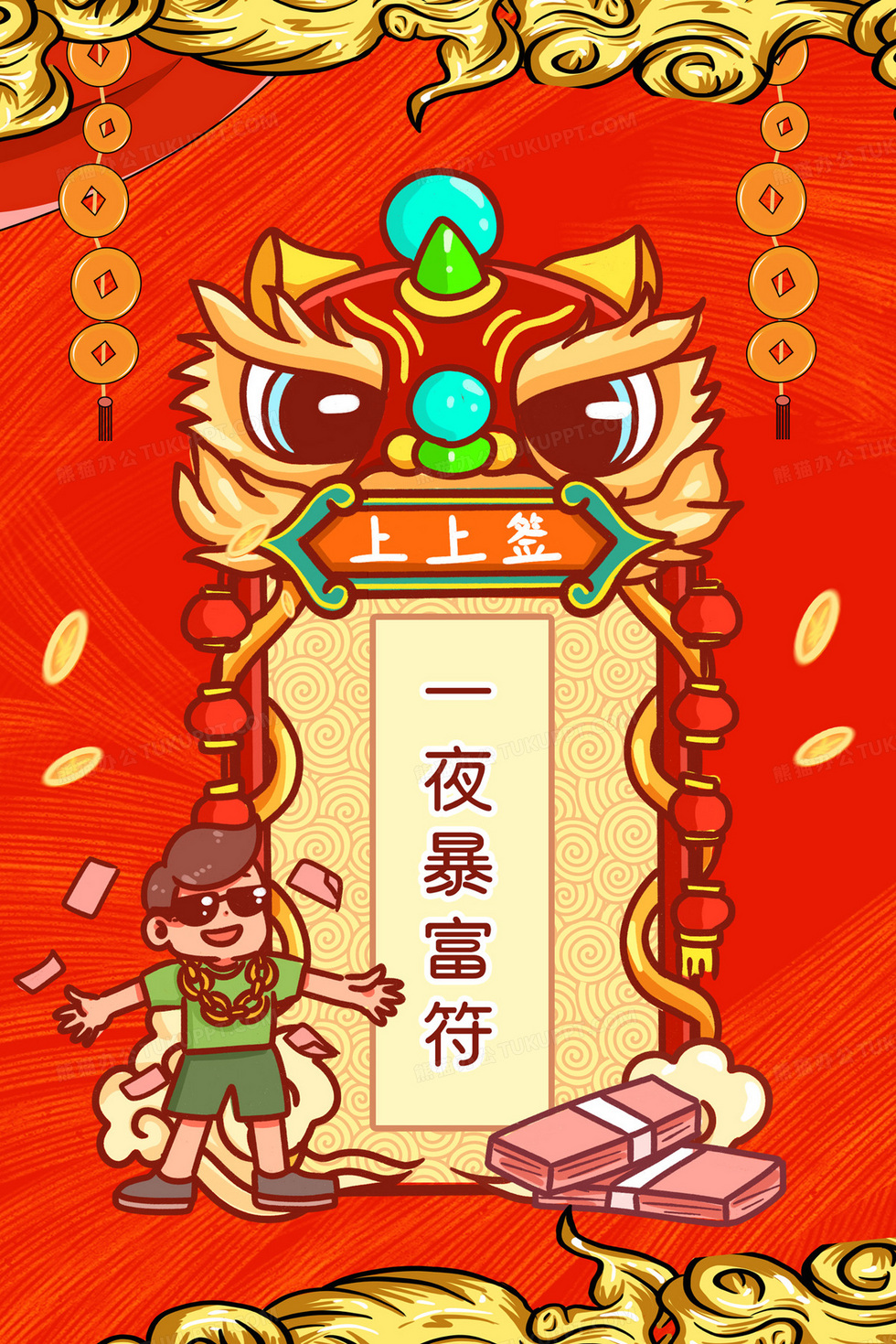 本作品内容为红色一夜暴富上上签国潮创意插画, 格式为 psd, 大小74 MB, 请使用软件PhotoShop(CC)打开, 源文件无水印, 欢迎使用熊猫办公。 如认为平台内容涉嫌侵权,可通过邮件:tousu@tukuppt.com提出书面通知,我们将及时处理。