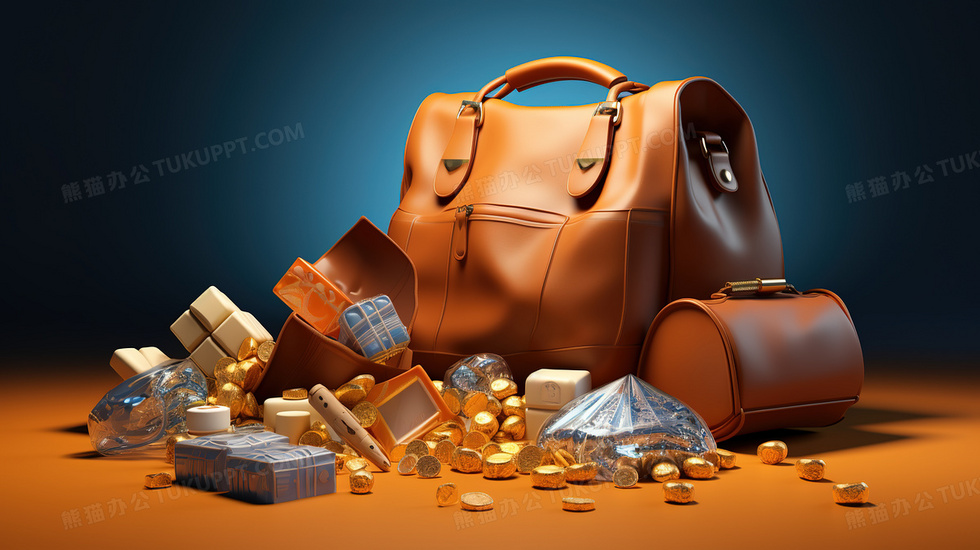 本作品内容为3D皮革包包装满物品购物插画, 格式为 jpg, 大小6 MB, 图片尺寸为2912 x 1632, 源文件无水印, 欢迎使用熊猫办公。 如认为平台内容涉嫌侵权,可通过邮件:tousu@tukuppt.com提出书面通知,我们将及时处理。