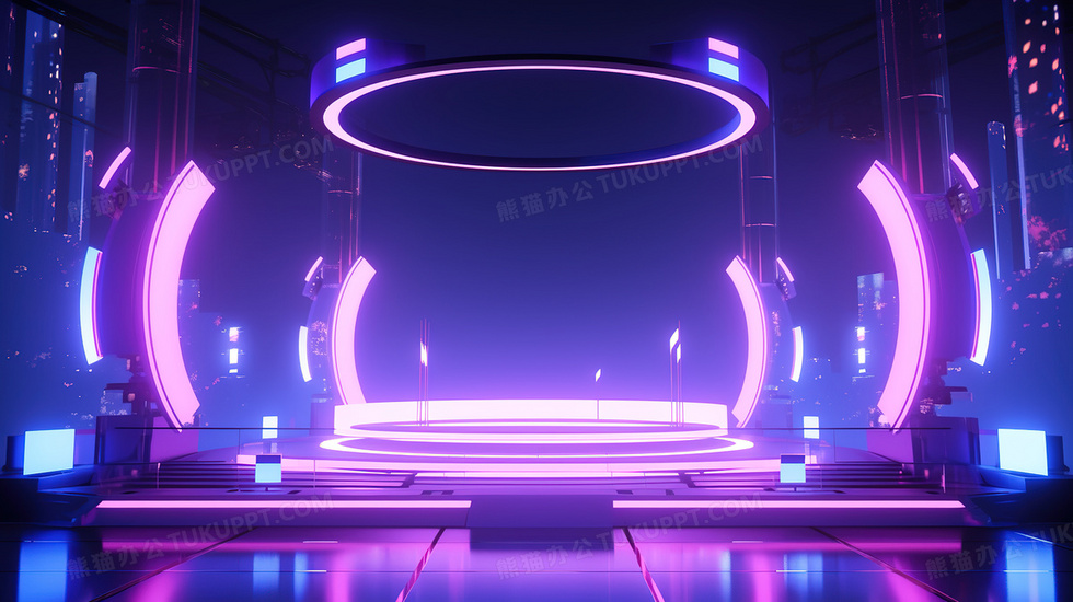 本作品内容为紫色灯光科技感节目舞台展台插画, 格式为 jpg, 大小5 MB, 图片尺寸为2912 x 1632, 源文件无水印, 欢迎使用熊猫办公。 如认为平台内容涉嫌侵权,可通过邮件:tousu@tukuppt.com提出书面通知,我们将及时处理。
