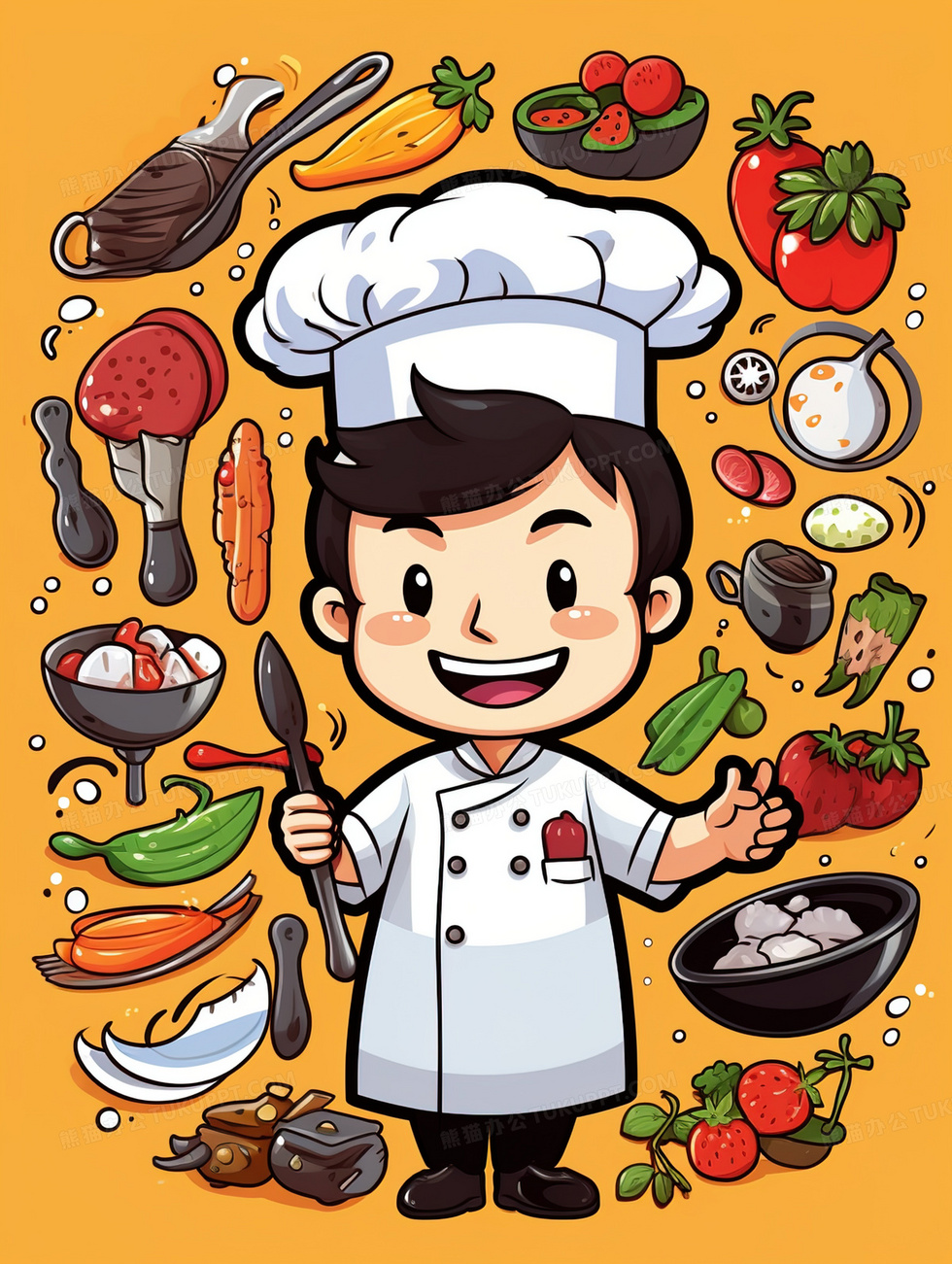 本作品内容为丰富的食材和烹饪的厨师卡通插画, 格式为 jpg, 大小5 MB, 图片尺寸为1856 x 2464, 源文件无水印, 欢迎使用熊猫办公。 如认为平台内容涉嫌侵权,可通过邮件:tousu@tukuppt.com提出书面通知,我们将及时处理。