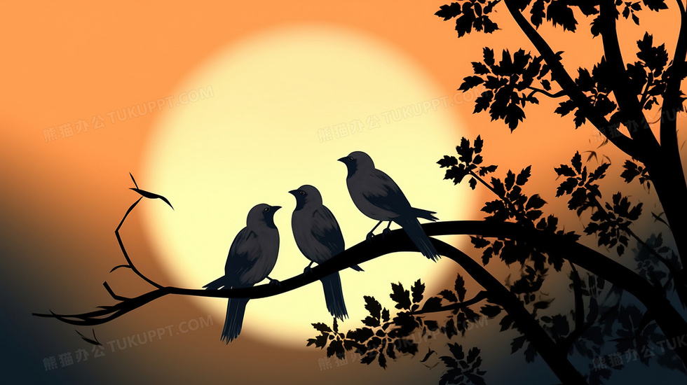 本作品内容为黄昏下在树枝上站立的小鸟剪影插画, 格式为 jpg, 大小2 MB, 图片尺寸为2912 x 1632, 源文件无水印, 欢迎使用熊猫办公。 如认为平台内容涉嫌侵权,可通过邮件:tousu@tukuppt.com提出书面通知,我们将及时处理。